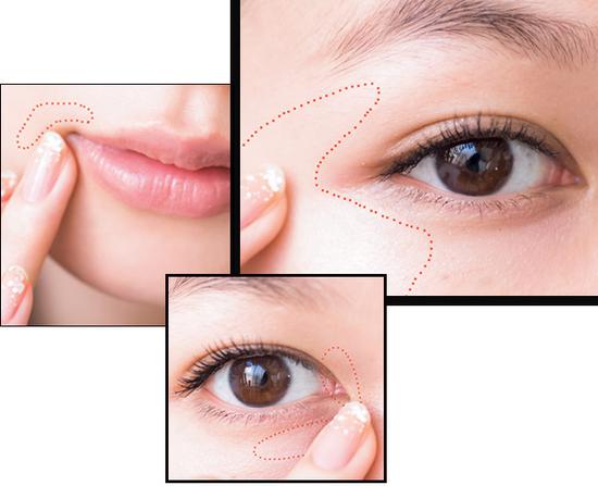 STEP:用手指沾取高光产品,轻轻获得红色虚线画的部分,显出光泽肌同时能调剂妆容的柔和度和整体感。
