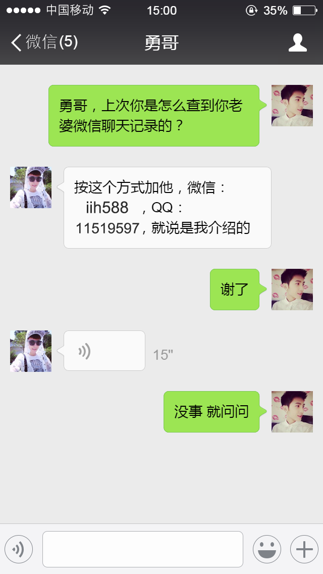 按照勇哥给我的微信号,我查到了老婆的聊天记录。