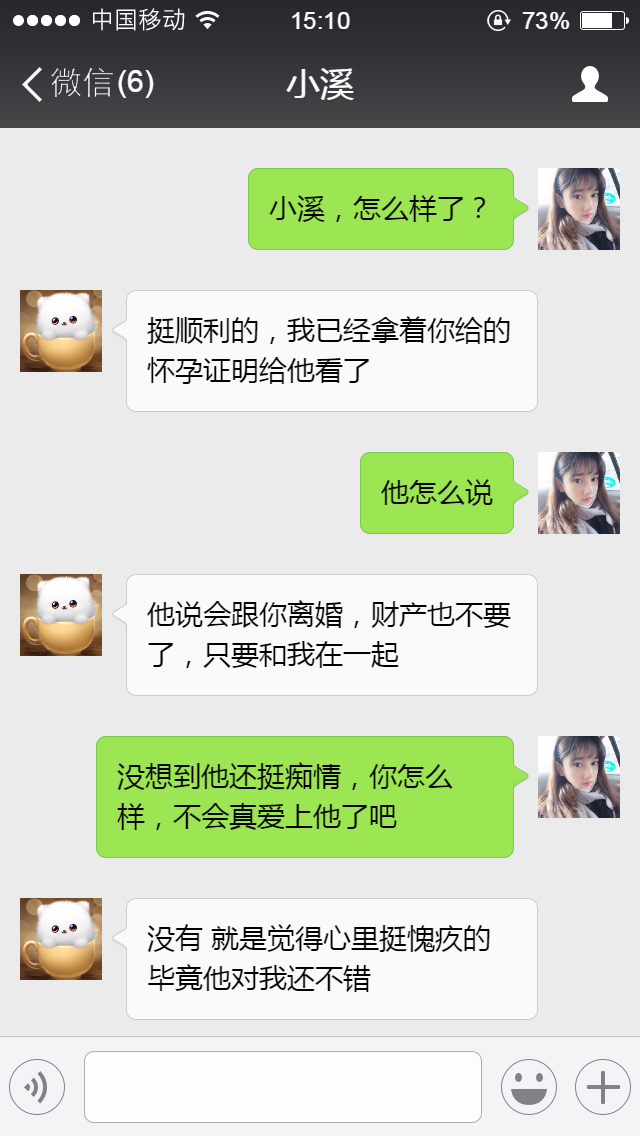 小溪知道我有老婆,但是从来没要求过我什么,只是一心对我好,直到有一天,小溪拿着怀孕的医院证明哭着问我怎么办的时候,我决定为眼前这个楚楚可怜的女人和肚子里的孩子做些什么,我回到家,找到了老婆,准备和她离婚,并承诺把大部分财产给她,没想到老婆没有问任何原因,很爽快的就答应了,这让我很疑惑。后来经别人介绍,我知道了查看老婆的微信聊天记录方式。